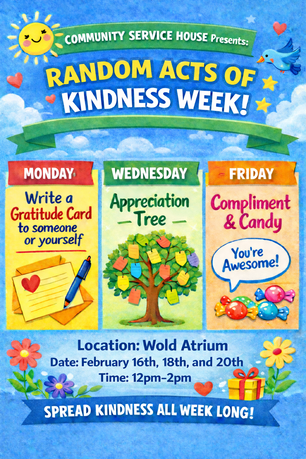 Join us Friday, 2/20, (12-2pm) for Compliments & Candy. Stop by, grab a random compliment, and enjoy some sweet treats as we wrap up our Random Acts of Kindness Week events. Come end the week on a positive note and spread a little extra kindness!!