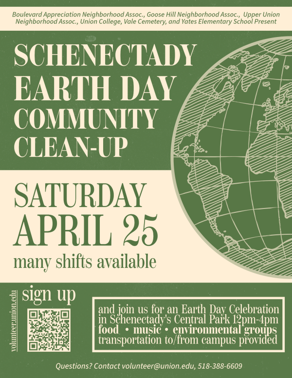 This year's Earth Day Community Clean-up culminates with a free festival in Schenectady's Central Park - including music, food, and activities. Students are invited to attend the event to celebrate their participation in Earth Day activities and connect with our friends and neighbors. A bus is available for students to and from the celebratory festival - rsvp to reserve a spot.